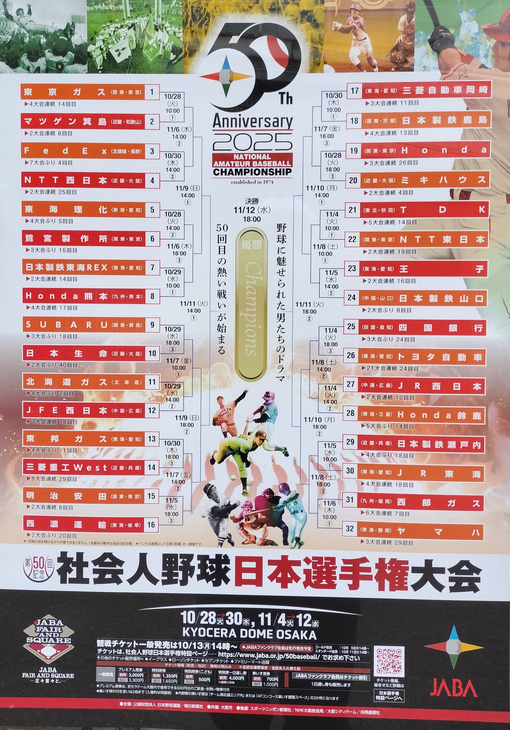 10/28(火)~10/30(木)、11/4(火)~11/20(水)に京セラドーム大阪にて『社会人野球 日本選手権大会』が開催予定となっており、王子硬式野球部は 11/5(水)14:00 が初戦となります